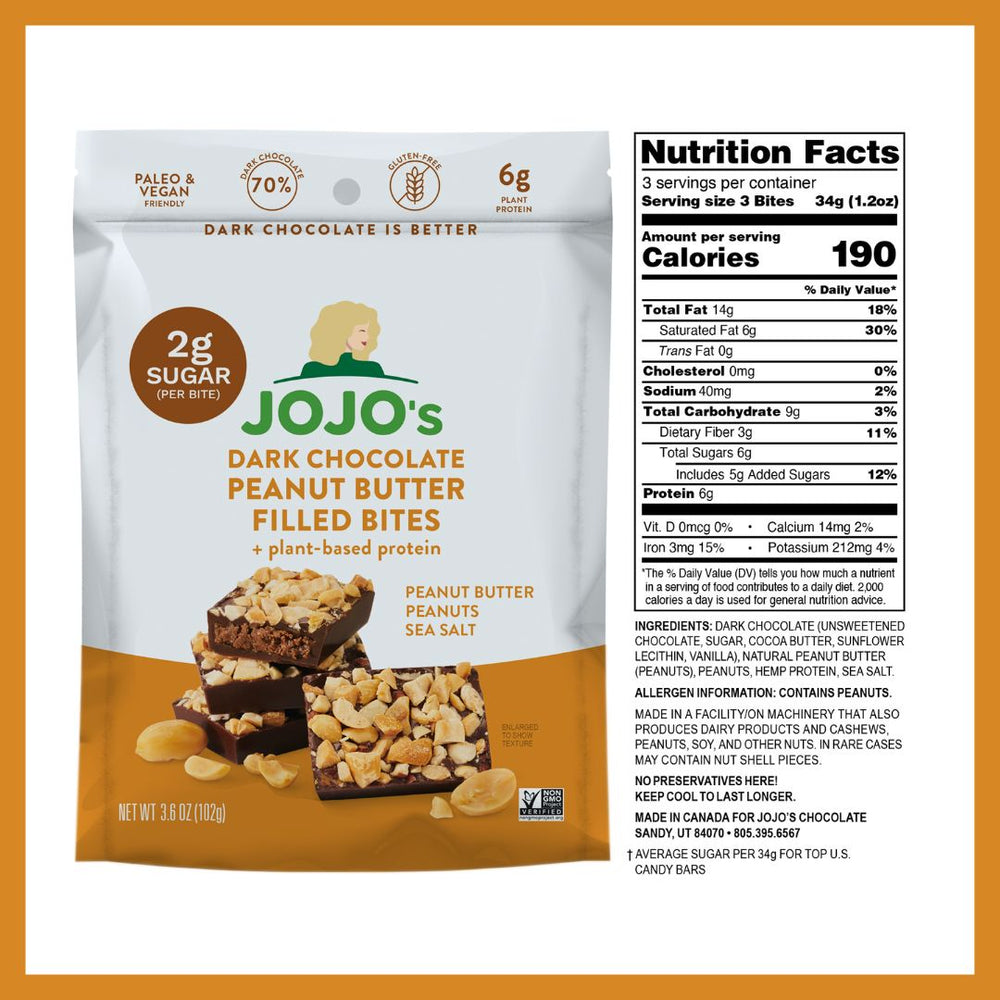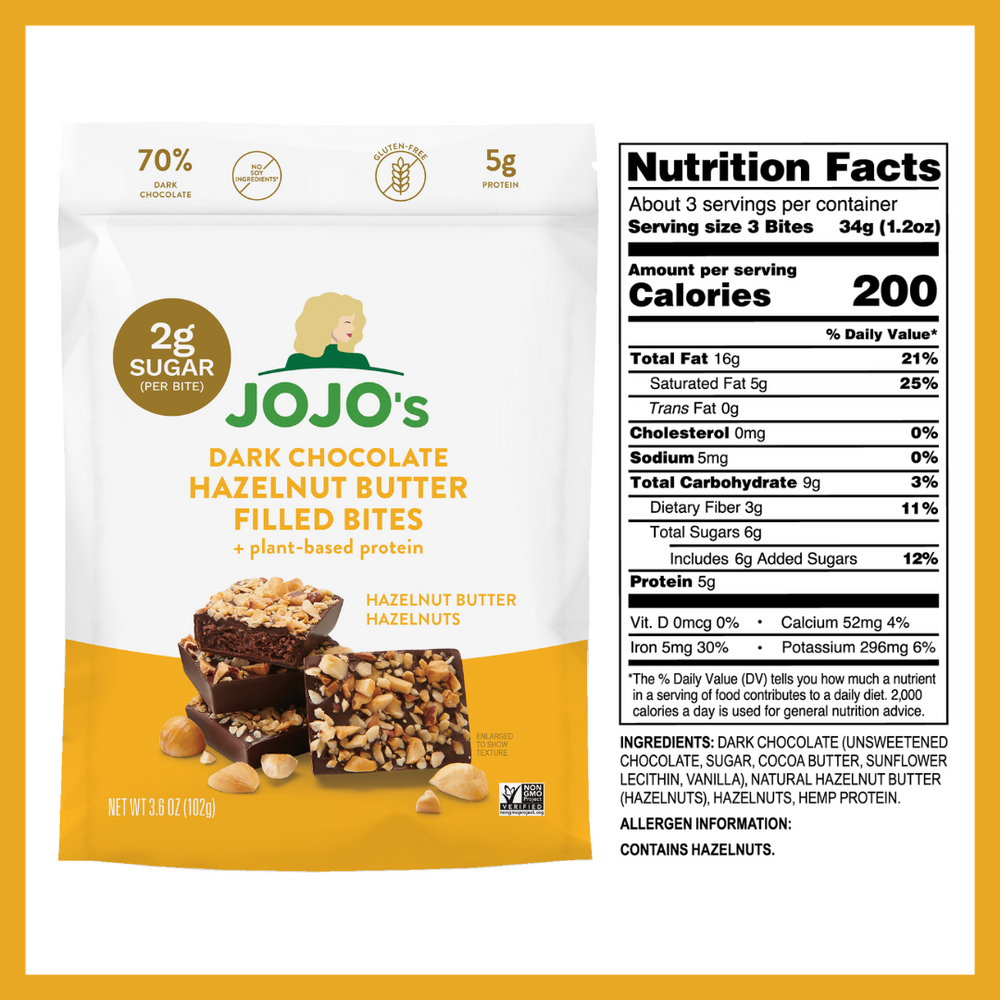 WHY WE MADE IT: What’s better than one bag of JOJO's? 4 of them! We took our deliciously snackable nut-butter filled dark chocolate snack-treats and bundled them so you can spend less time shopping and more time enjoying JOJOs. You’ll receive 2 bags of Peanut Butter Filled and 2 bags of Hazelnut Filled to enjoy anytime you need a filling, delicious, better-for-you treat!