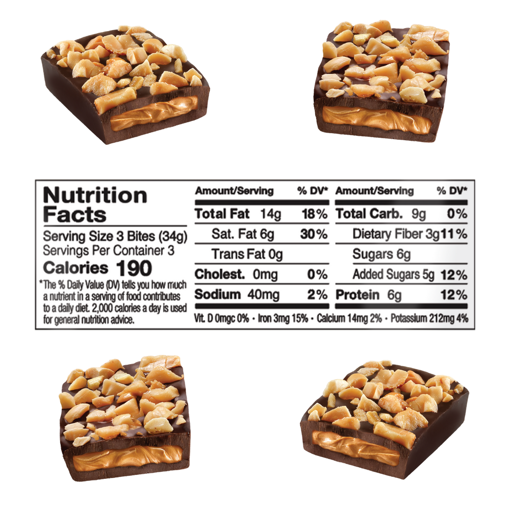 WHY WE MADE IT: There’s just something so right about peanut butter and chocolate, so we HAD to make our own spin on this dynamic duo. Peanut buttery goodness in every bite, without all the extra sugar. With 70% dark chocolate boosted with plant-based protein, full of all-natural peanut butter, and topped with a sprinkling of peanuts, this is a treat beyond compare. Think, your favorite peanut butter cup, but better AND better for you!